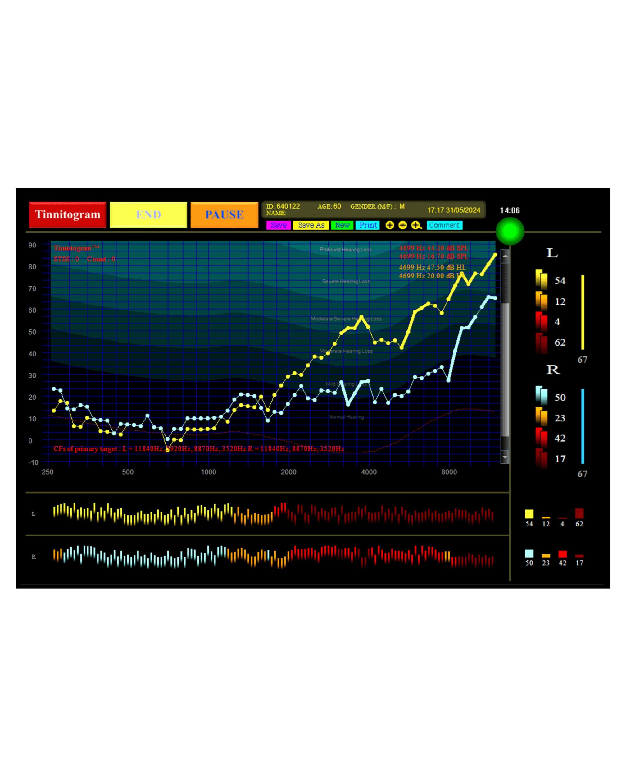 Includes detailed hearing analysis, measuring 67 frequencies using the TinnitogramTM